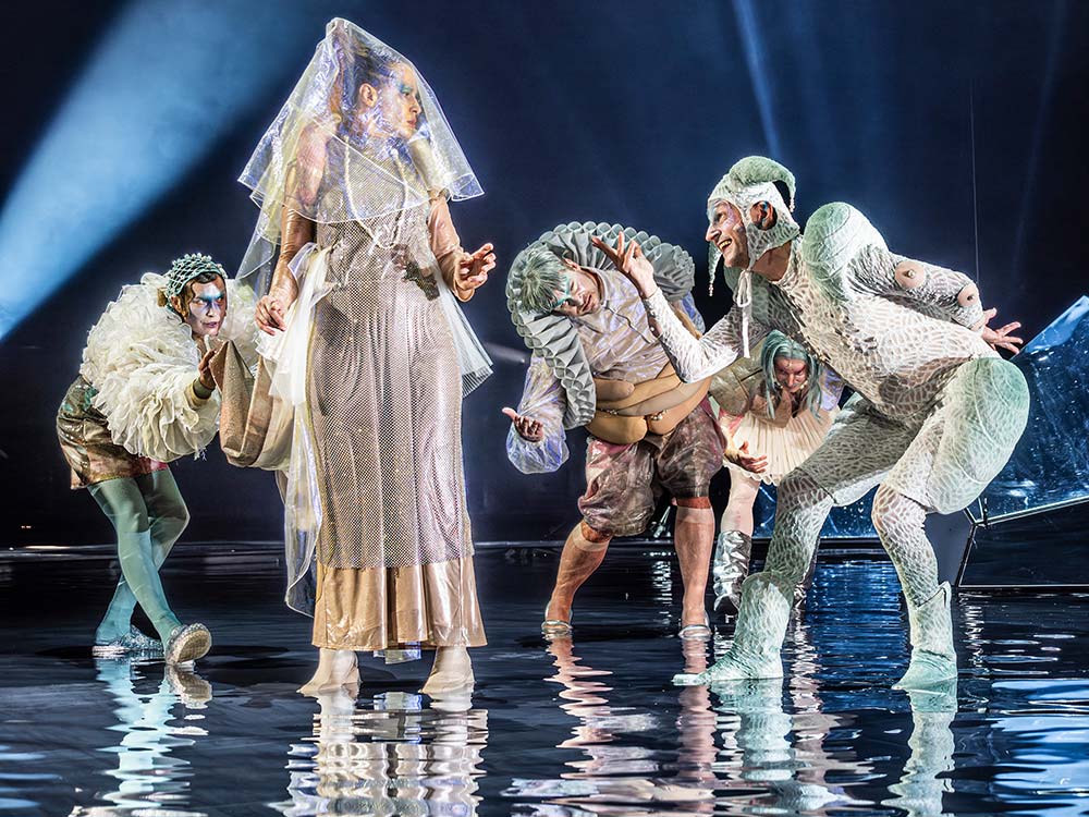 Diese Kisten auf der Bühne, auch Felsen in einem kleinen Meer, in dem die Spielenden stehen und agieren, sind aus spiegelndem Glas und sorgen auch für ausreichende Selbstbespiegelung. Mit ihren schillernden Kostümen lieben und irren die Charaktere durch ein Fest der Sinne, in diesem prallen Shakespeare, in dieser Komödie, die offensichtlich allen Spaß gemacht hat, und die mit langem, langem Applaus vom Publikum belohnt wird.