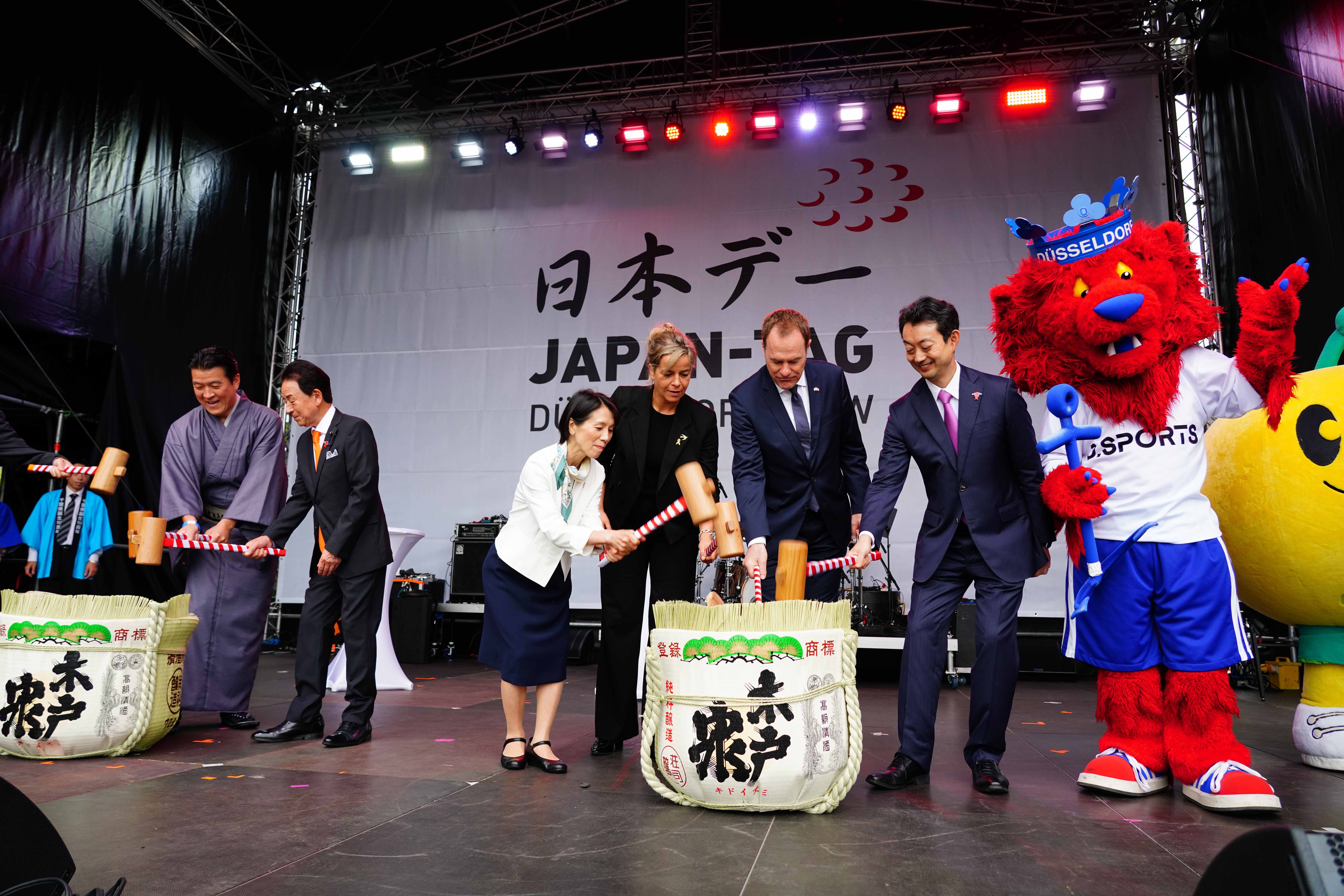 Um 12:00 Uhr hat Oberbürgermeister Dr. Stephan Keller gemeinsam mit der Ministerin für Wirtschaft, Industrie, Klimaschutz und Energie des Landes Nordrhein-Westfalen Mona Neubaur, Takao Hariya, dem Präsidenten des Japanischen Clubs, Toshihito Kumagai, dem Gouverneur der Präfektur Chiba und der japanischen Generalkonsulin Setsuko Kawahara durch Anschlagen des Sake-Fasses den 21. Japan-Tag Düsseldorf/NRW feierlich eröffnet. / Foto (c) D.LIVE, Albrecht Korff