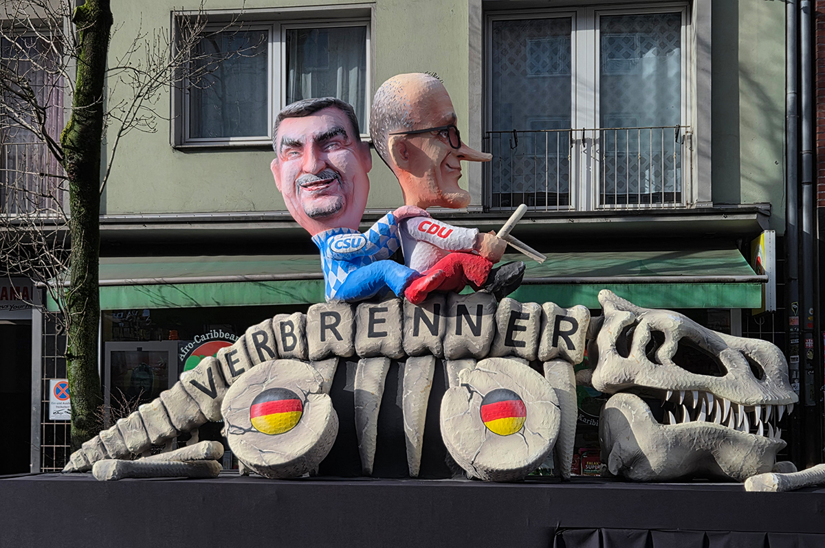 Verbrenner-Dino: Merz/Söder auf dem Skelett (Mottowagen 2026)