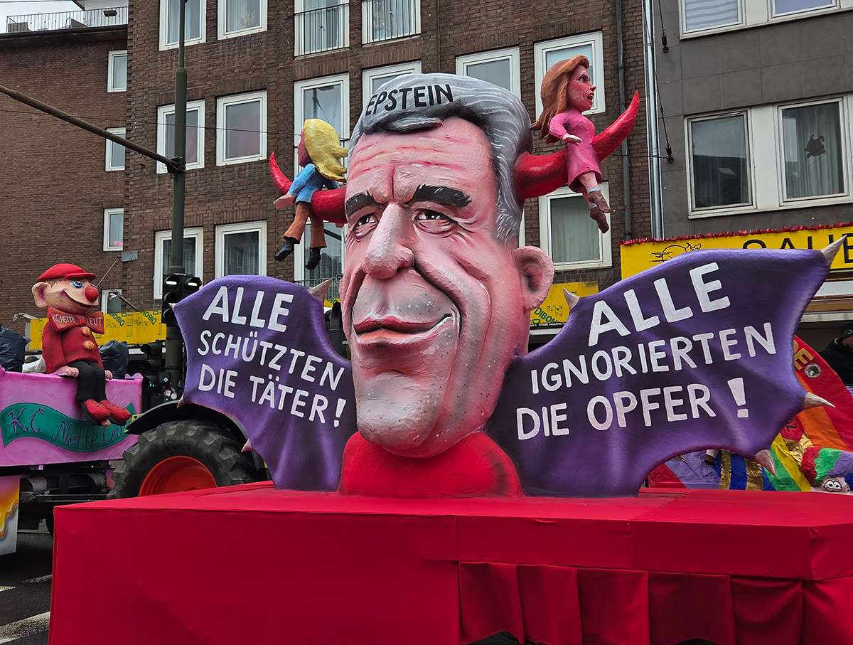 Epstein-Motiv - Ein riesiger Kopf, klare Botschaft: Der Wagen prangert an, wie Machtmissbrauch funktioniert – und wer dabei oft übersehen wird. / Foto: Jo Achim Geschke, NDOZ