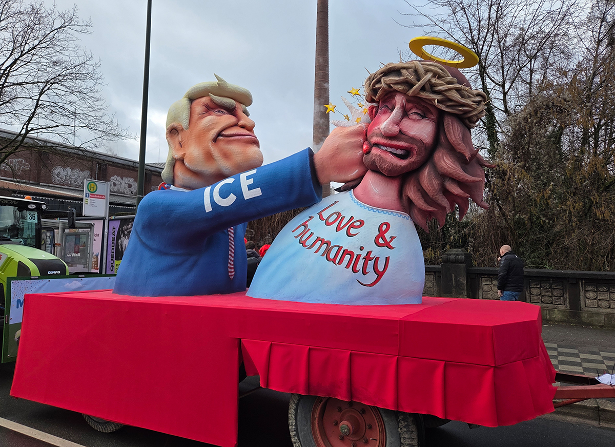 Trump/ICE-Motiv im Düsseldorfer Rosenmontagszug 2026 – Ein Motiv über Macht, Härte und Widersprüche. / Foto: Jo Achim Geschke, NDOZ