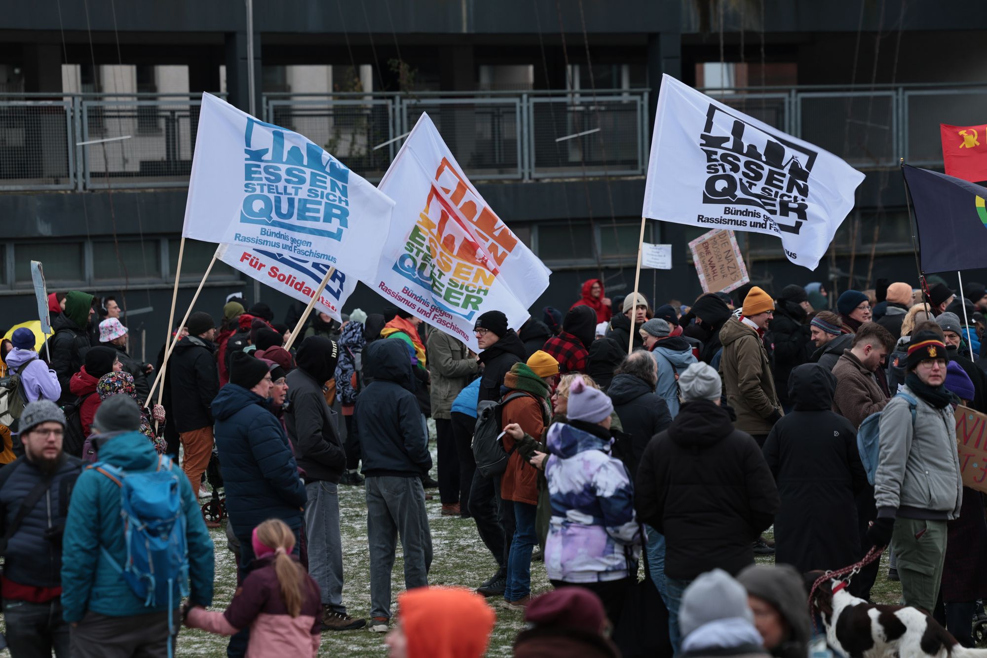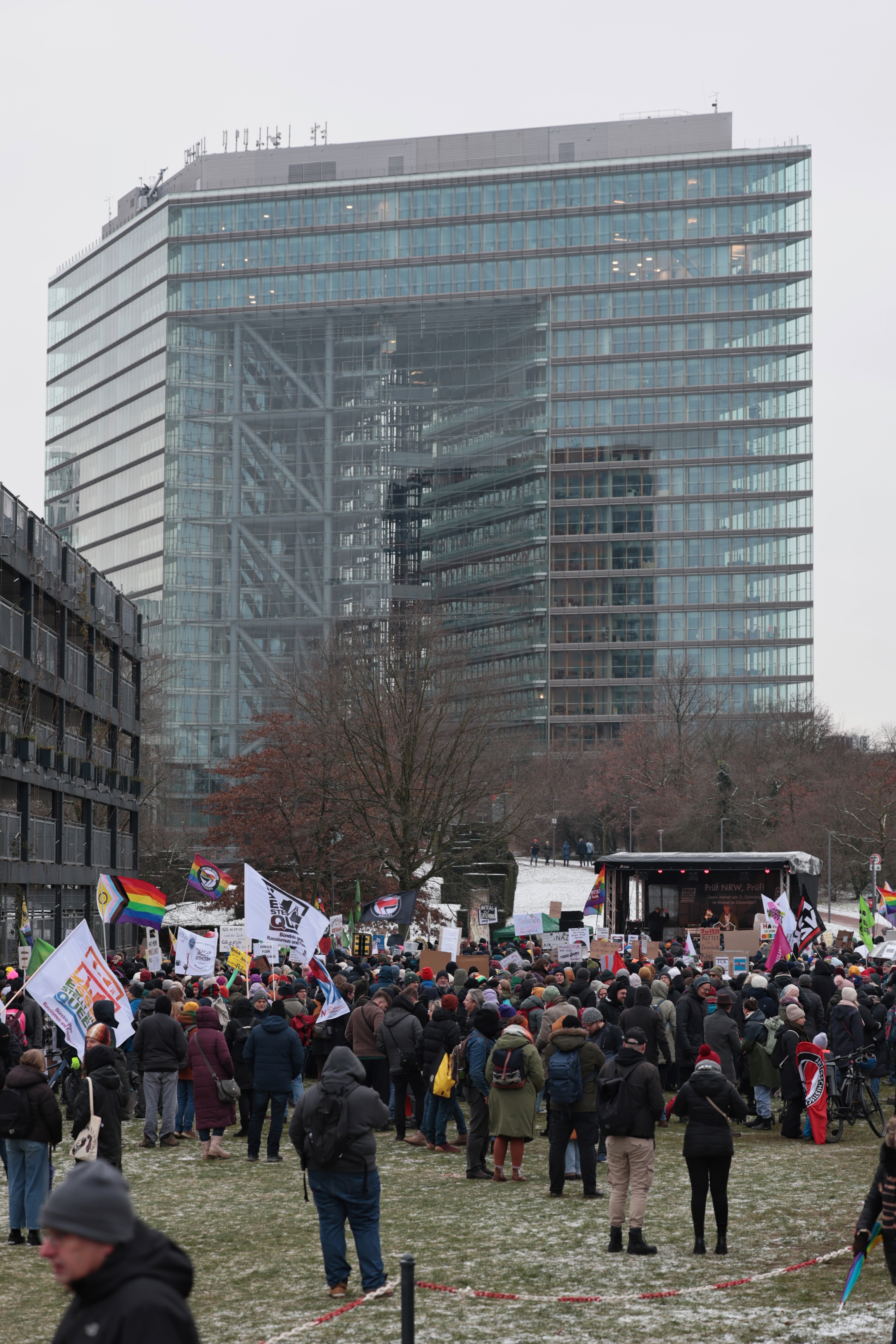 Es ist kalt am Rhein, die Winterjacken sind hochgezogen – und vor dem NRW-Landtag ist trotzdem viel Bewegung. Plakate ragen über die Menge: „Taten jetzt“, „Demokratie statt Dummheit“, daneben Regenbogenfarben, selbstgemalte Schilder und ein großes Augenzwinkern („Hurra, eine Prüfung“). Am Samstag, 10. Januar 2026, haben nach Angaben der Initiative rund 3.000 Menschen auf der Landtagswiese demonstriert – es war die erste PRÜF-Demonstration in Düsseldorf. Klaus von Jackelmann war für NDOZ vor Ort und hat die Kundgebung fotografisch begleitet.