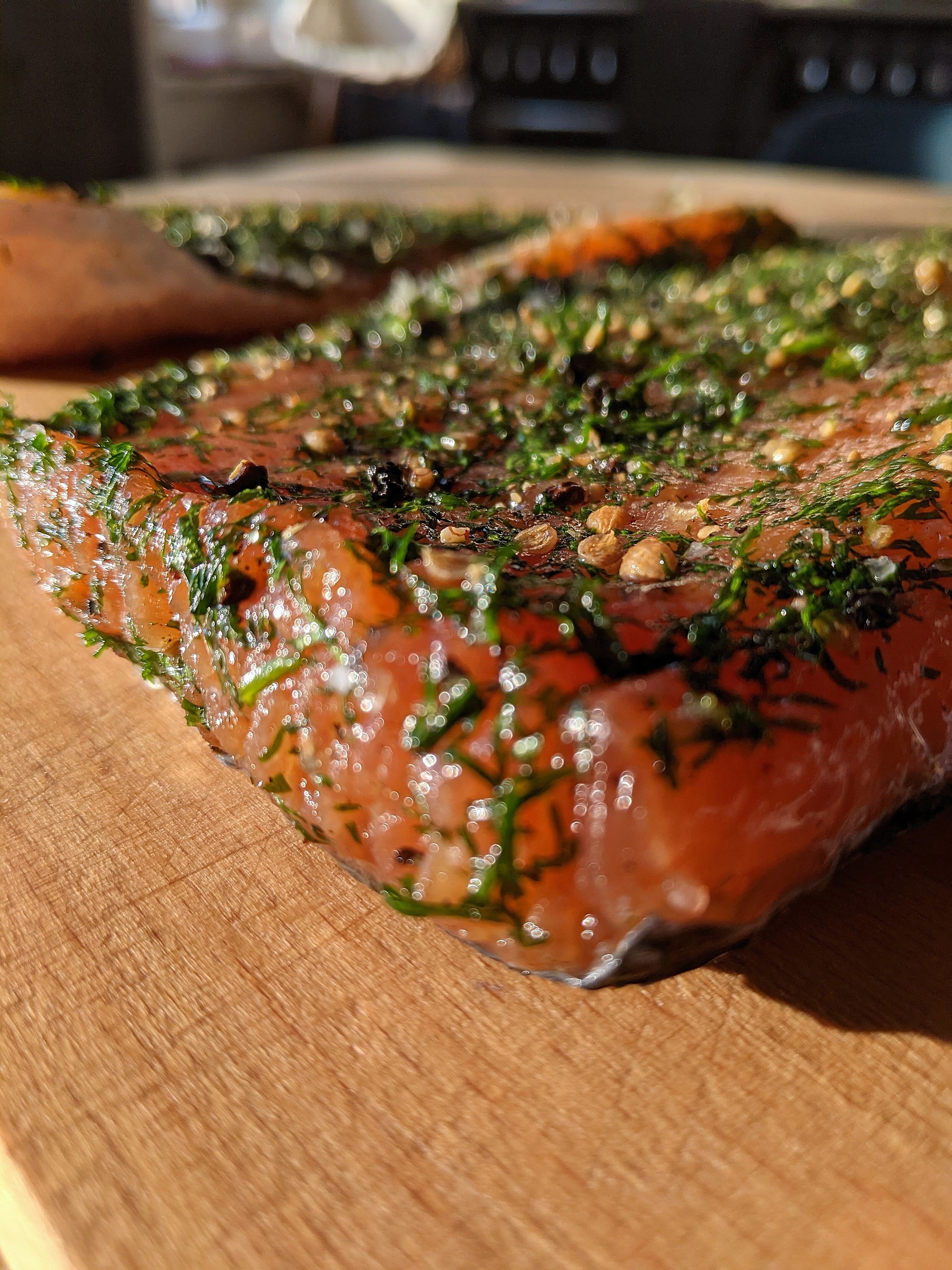 Nach 48 Stunden Beizzeit: fester, glänzender Graved Lachs, durchzogen von Dill, Pfeffer und Koriandersamen. / Foto: Alexandra Scholz-Marcovich, NDOZ.