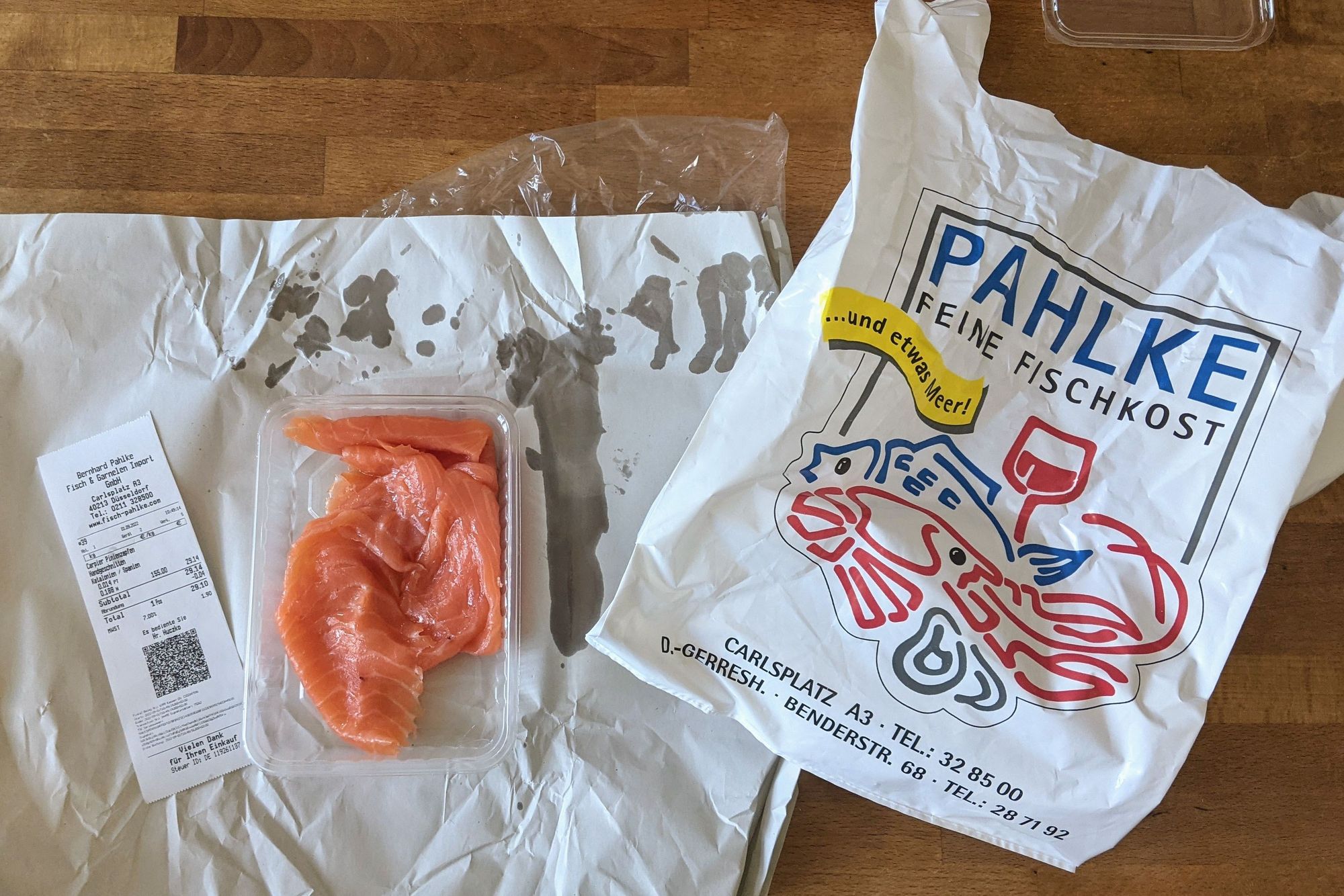 Fertig gebeizter Lachs von der Fischtheke am Carlsplatz: ausgezeichnete Qualität, aber zum sehr hohen Preis (155,00 € / Kg im September 2022). / Foto: Alexandra Scholz-Marcovich, NDOZ
