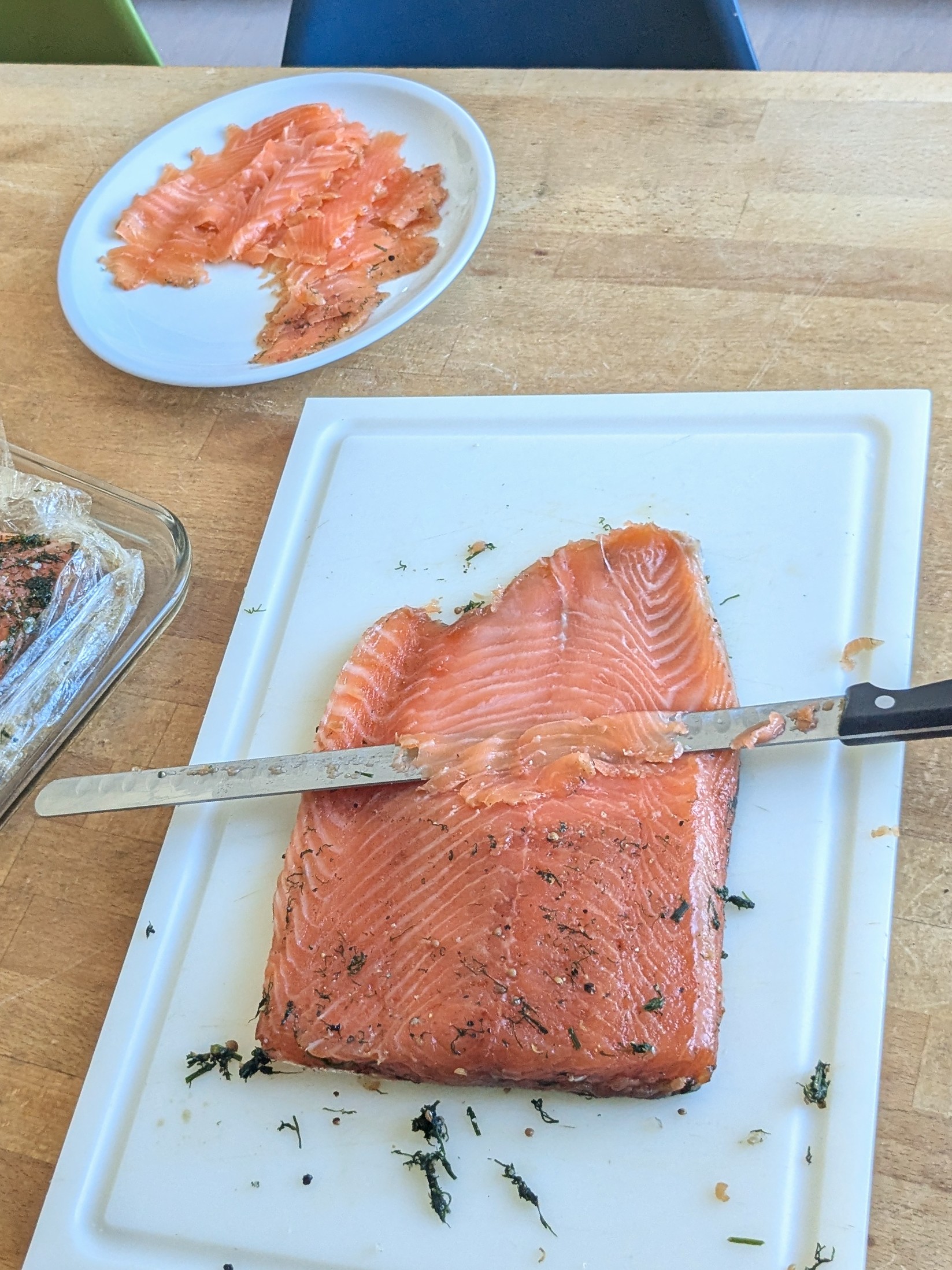 Dünn aufschneiden mit einem langen, flexiblen Lachsmesser – so wird der Graved Lachs zart wie beim Feinkoststand. / Foto: Alexandra Scholz-Marcovich, NDOZ.