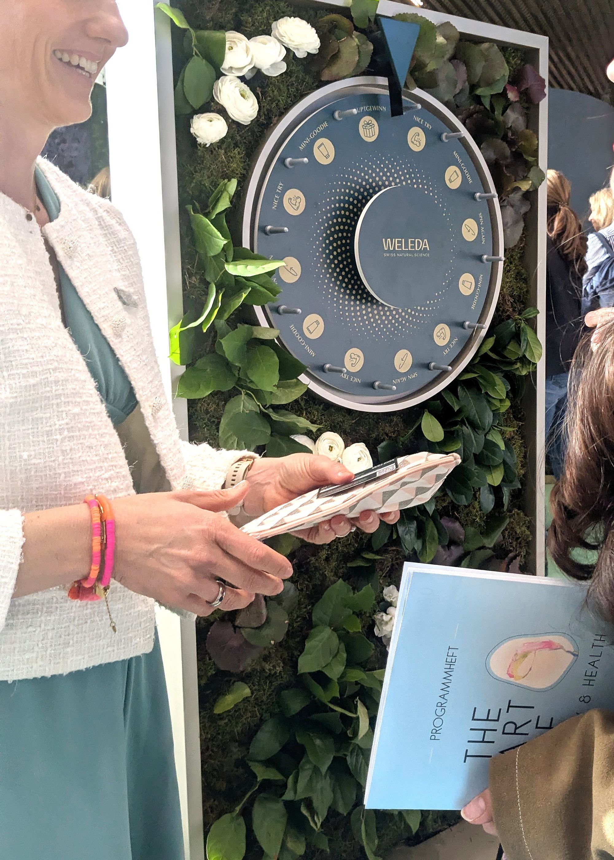 Der Weleda-Stand hat ein Glücksrad. Natürlich drehe ich. Natürlich gewinne ich — einen Probe-Set der neuen Cell Longevity Linie: NAD+ Booster und Astaxanthin. Ein Marketingmoment, der trotzdem funktioniert, weil die Produkte das Versprechen zumindest auf meiner Handfläche einlösen: angenehme Textur, zieht schnell ein, kein klebriger Film. Der typische Weleda-Duft ist da — dezent, aber erkennbar. Meine Hände sind seitdem weich. Das ist kein Werbeslogan, das ist ein Tatsachenbericht.