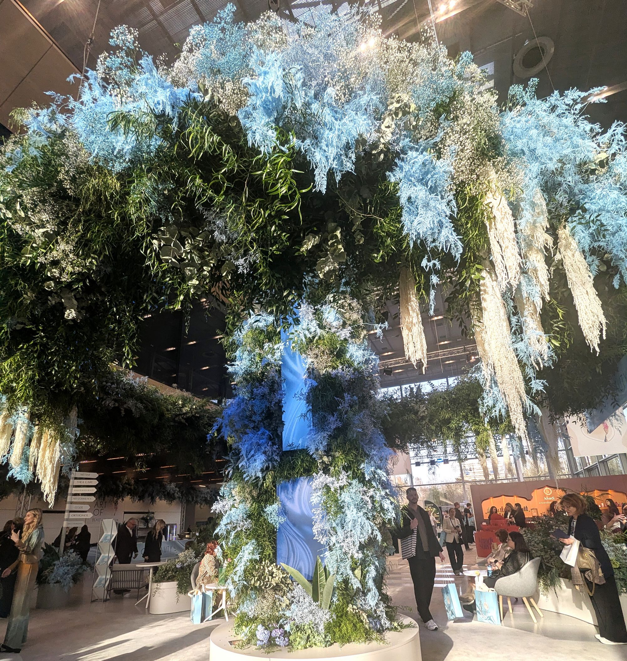 Der erste Blick gilt dem Baum. Ein riesiges Blumengebilde in Eisblau hängt über dem Glasfoyer der Messe Düsseldorf — Tausende von Blüten, die nach unten fallen wie in einem anderen Universum. Avatar lässt grüßen. Und ich bin beruhigt: Wir sind nicht bei Titanic.