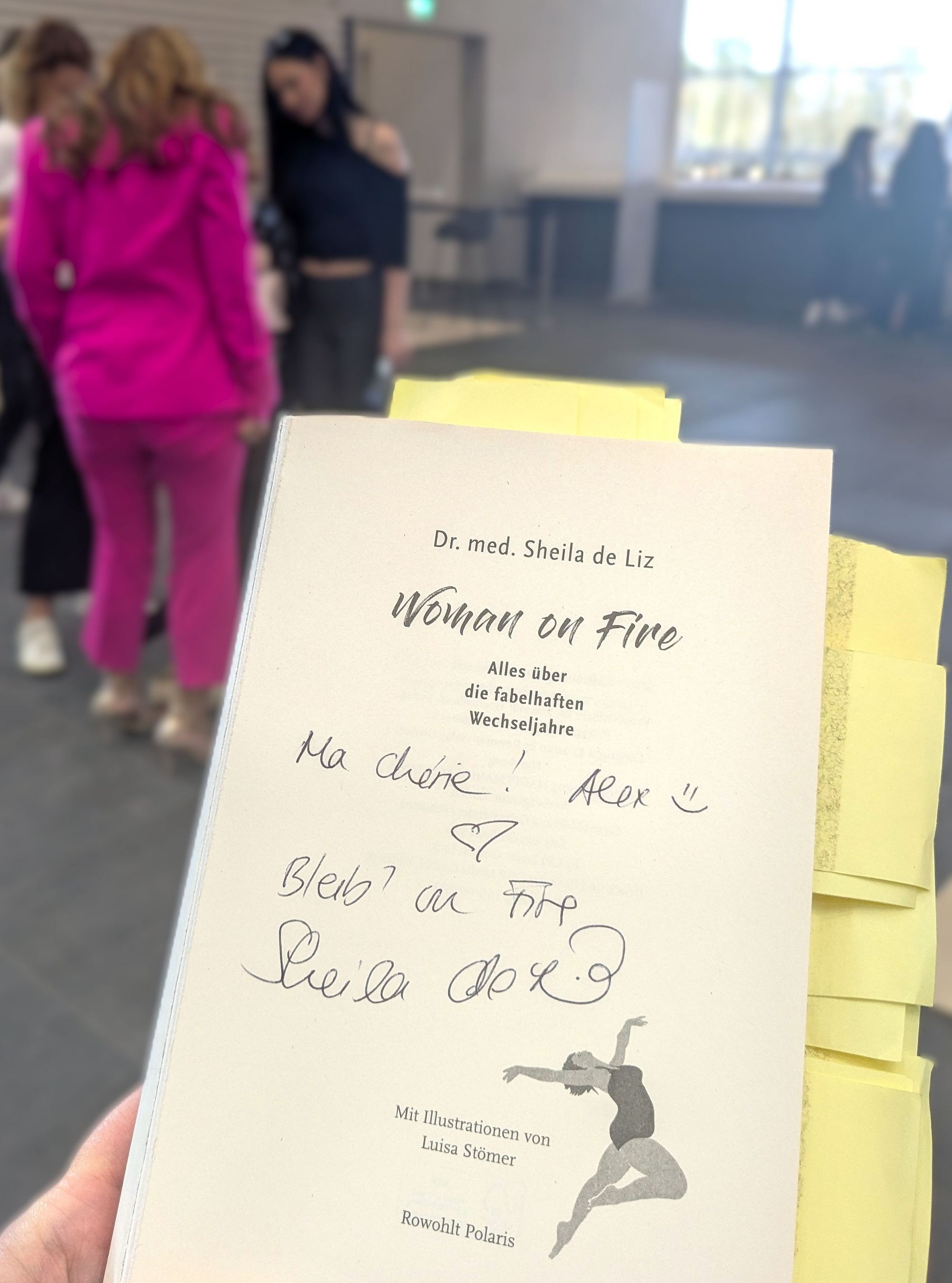 Als sie wieder freier ist, nehme ich meinen Mut zusammen. Ich hatte ihr Buch mitgebracht, für genau diesen Moment. Sie lacht, sieht die gelben Post-its, die überall herausragen. Jennifer Knäble zeigt drauf: „Schau mal — die ganz wichtige Sache!" Sheila nimmt einen Stift und widmet. Weil sie weiß, dass ich Französin bin: „Ma chérie ! Alex" — Herz, Smiley — „Bleib on Fire."