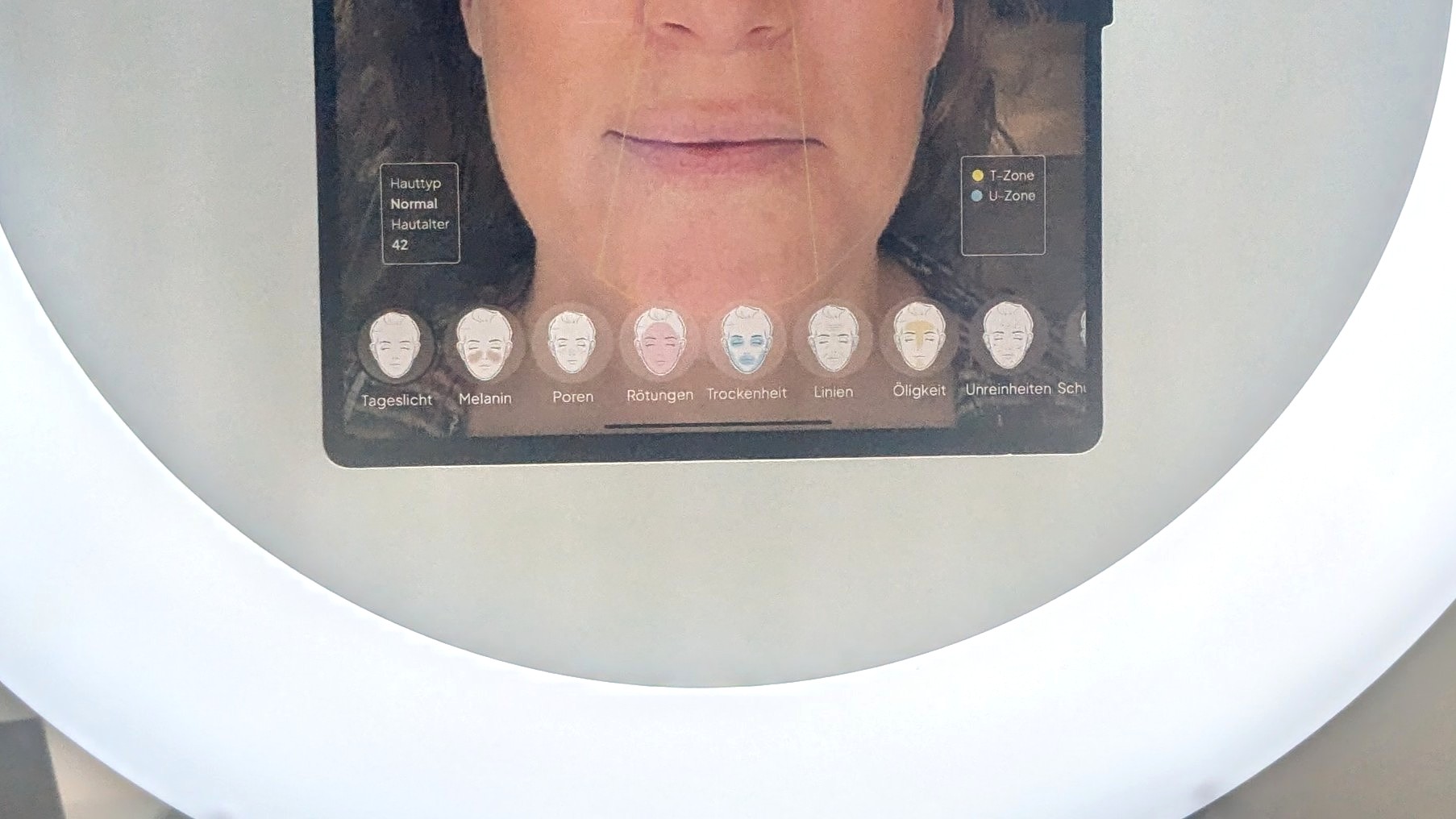 Ich muss mich auf die Zehenspitzen stellen, um mein Gesicht ins Ringlicht zu positionieren. Wir lachen. Das Gesicht wird gescannt. Auf dem Bildschirm erscheint mein Gesicht in zwei Zonen: T-Zone in Gelb, U-Zone in Blau. Und dann: Hauttyp Normal. Hautalter — 42 Jahre. Ich bin bald 52. Das sind zehn gewonnene Jahre. Ich mag diese App immer mehr.