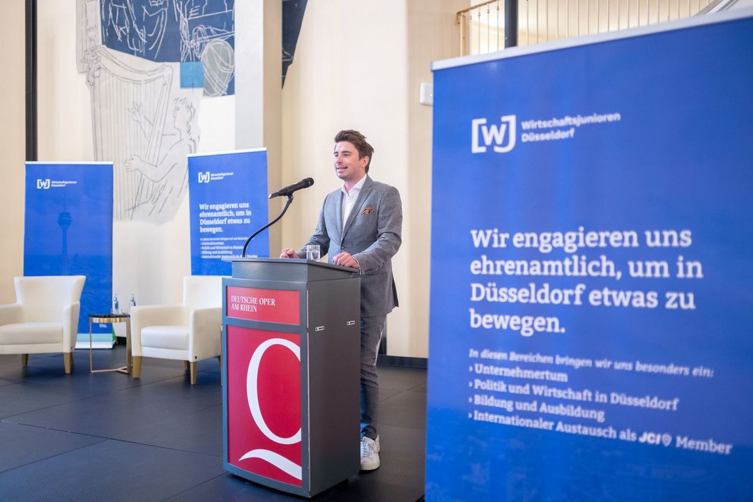 Für besondere Zusammenarbeit mit den Wirtschaftsjunioren wurde zudem die Geschäftsführende Direktorin der Deutschen Oper am Rhein, Alexandra Stampler-Brown, mit dem goldenen Radschläger geehrt. Als besondere Wertschätzung und Dank für seinen Vortrag erhielt zu guter Letzt auch René Obermann den goldenen Radschläger überreicht, bevor es zum legeren Ausklang mit Netzwerken überging.